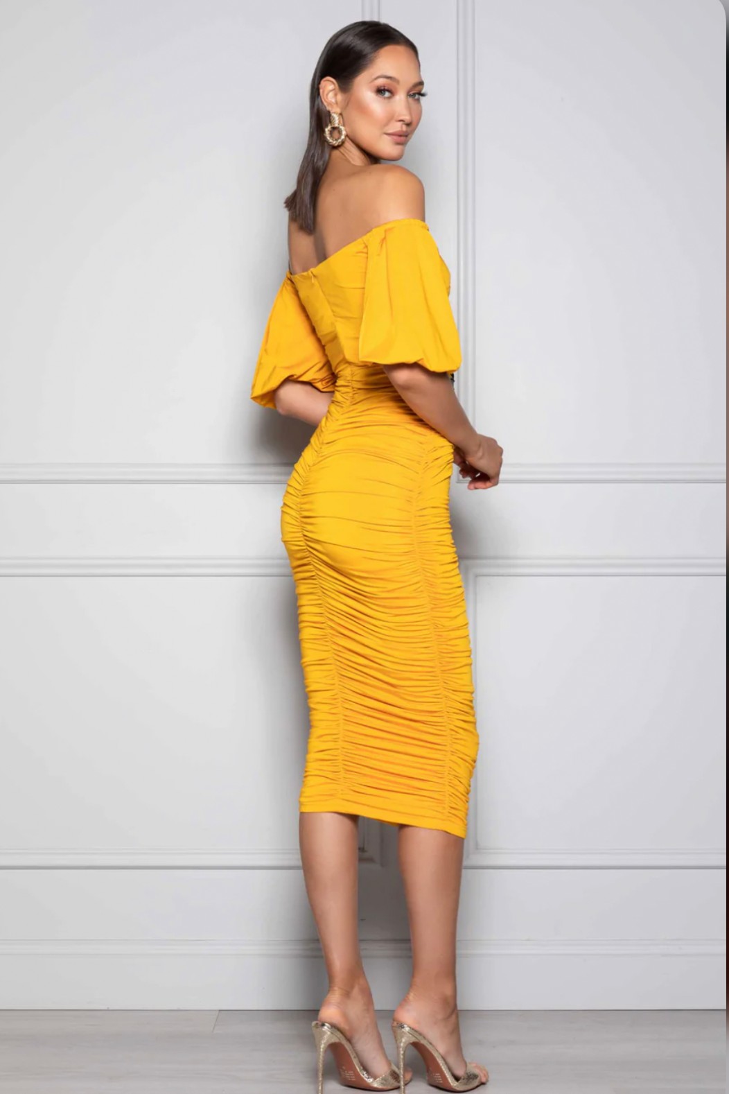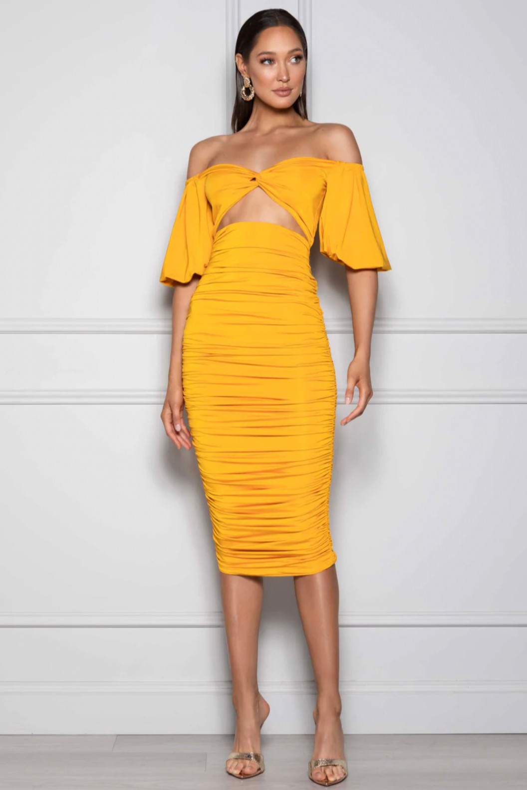 Straplez dökümlü kollu midi boy göğüste pencere detaylı drapeli kokteyl elbisesi