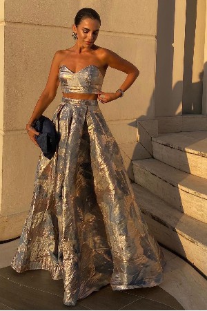 Askılarını isterseniz içeride gizleyerek straplez büstiyer olarak da kullanabileceğiniz Zoeikili set sizi modern ve çarpıcı tasarımıyla davetin en havalı kadını yapacaktır. Saçlarınızı balerin topuzu ile toplayın büyük halka ya da sallantılı küpeler takın ve zahmetsiz şıklığın keyfine varın
