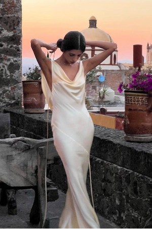Kayık ve dökümlü yaka sırtı açık sırtında dökülen uzun iple bağlanabilen bilek boyu saten elbise