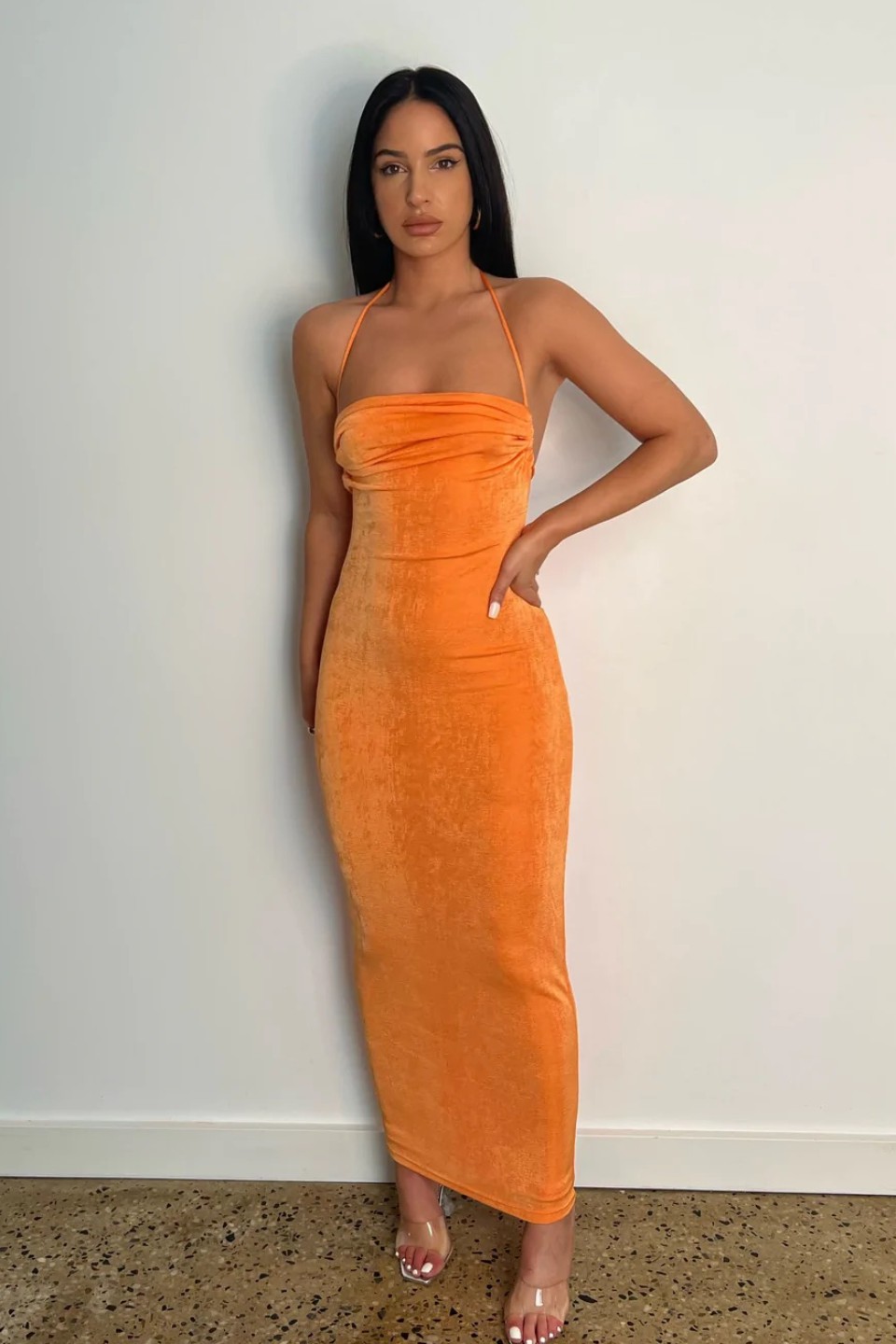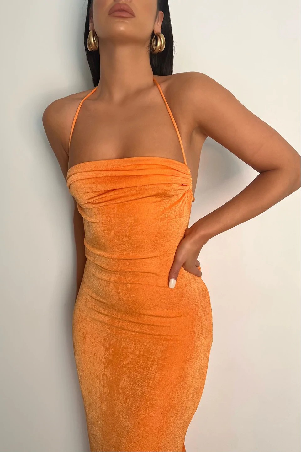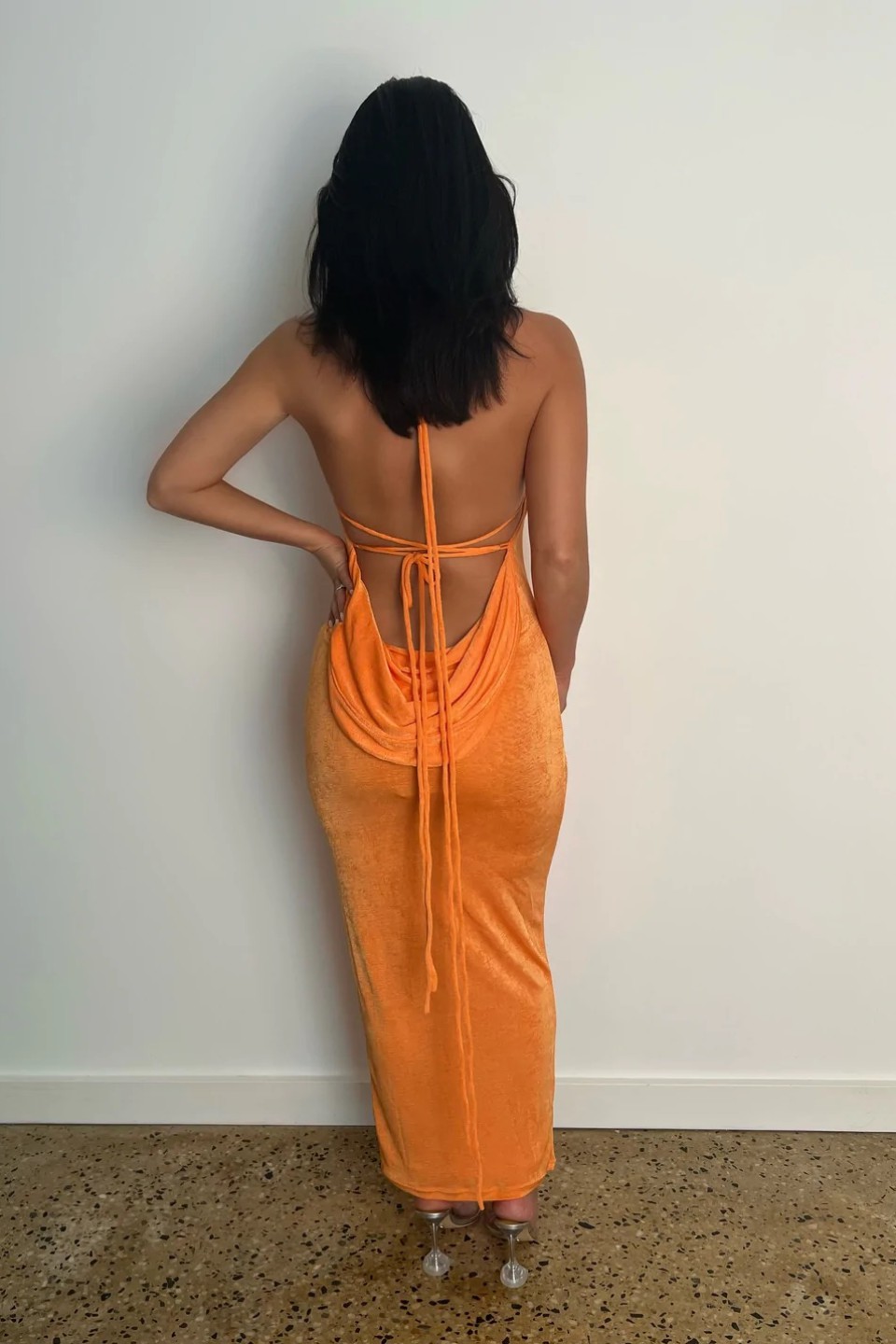 Göğüs drape dökümlü sırtı açık ve dökümlü uzun bağcıklı içi astarlı bilek boy elbise