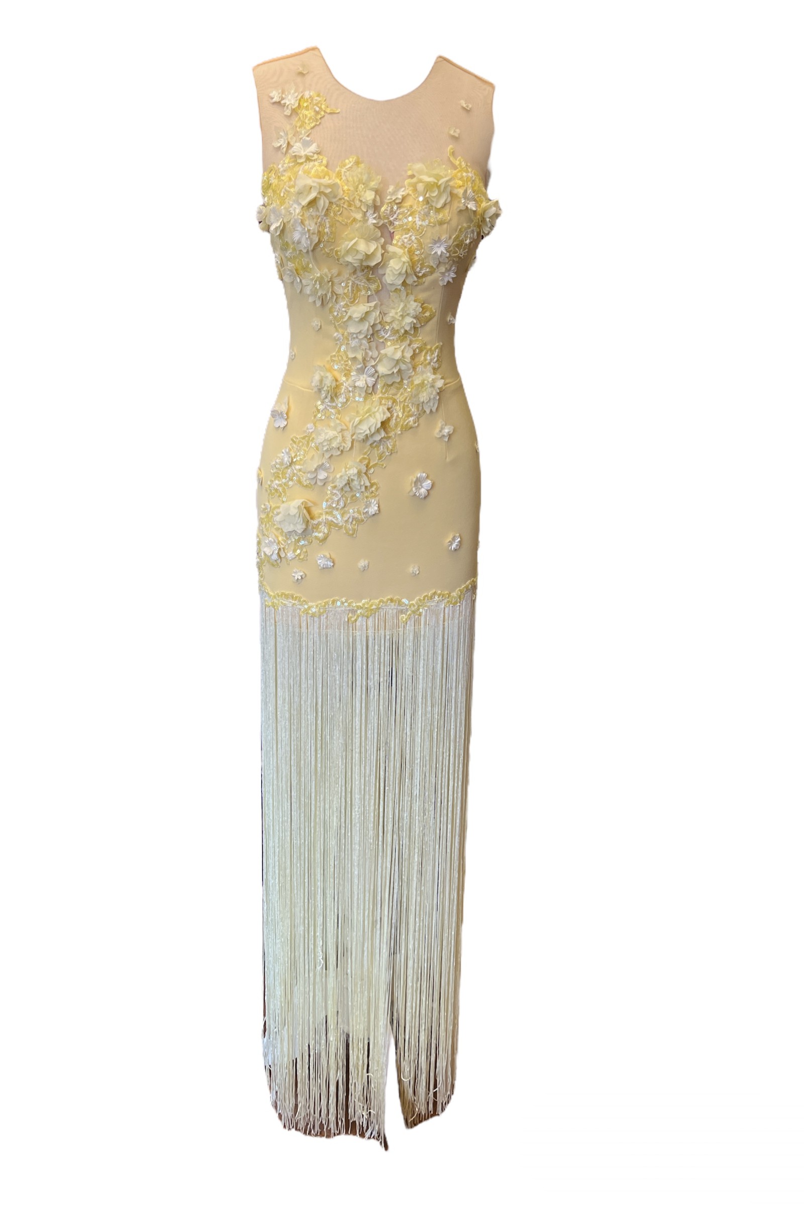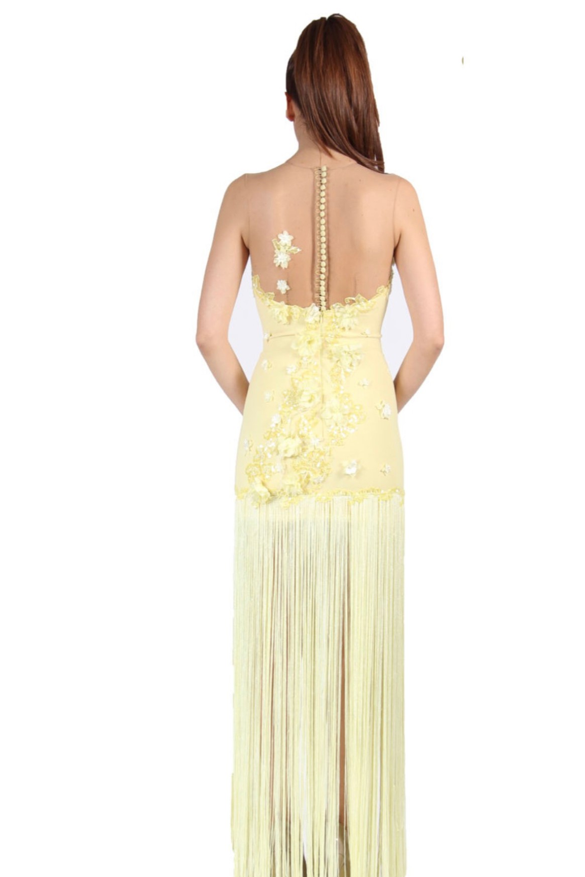 Hayalet tül üzeri üç boyutlu çiçek işlemeli sırt kısmı düğmeli mini etek sonrası püsküllü abiye elbise