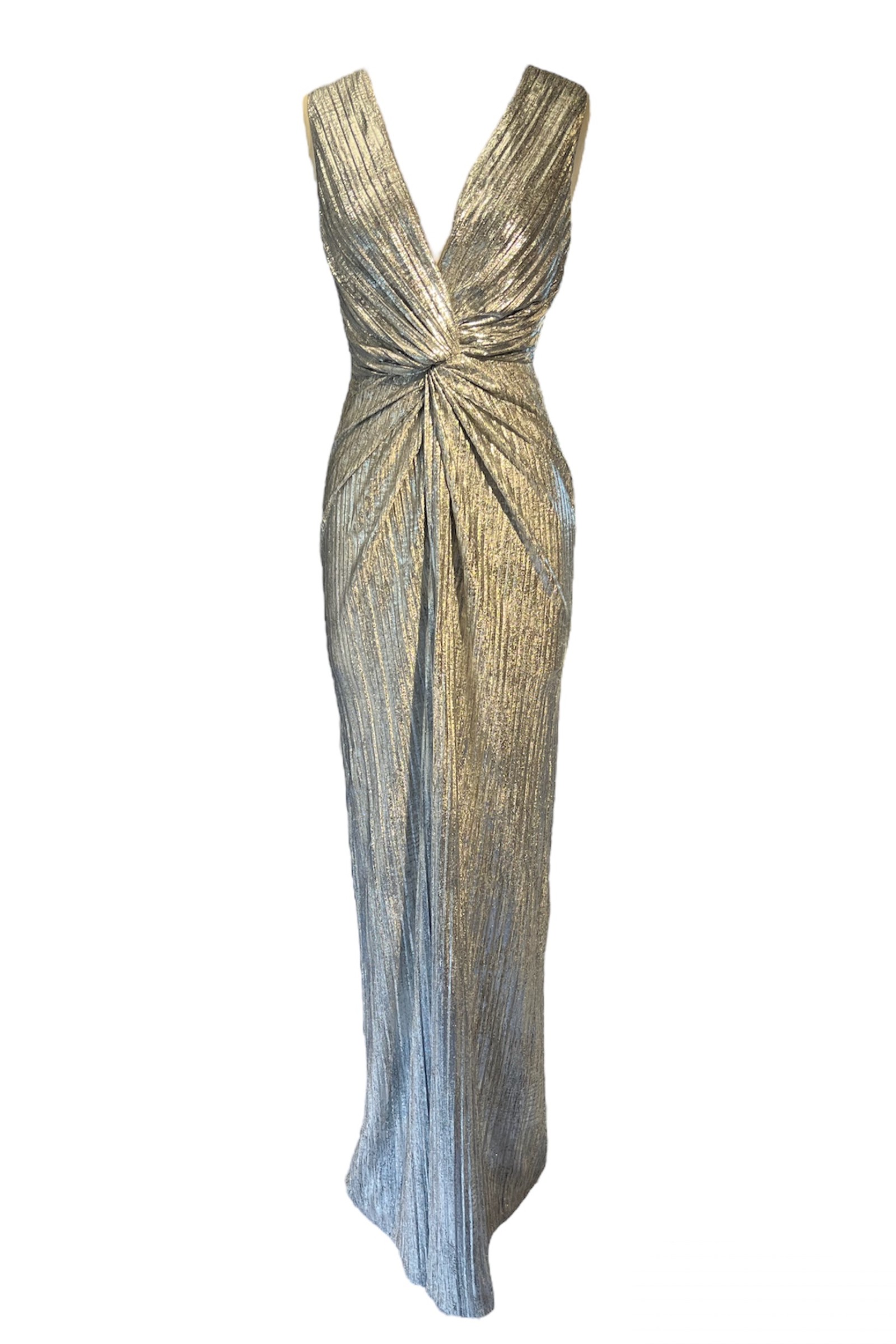Derin göğüs dekolteli sırtı açık önden derin yırtmaçlı önkısmı drape detaylı kendinden ışıltılı uzun gece elbisesi