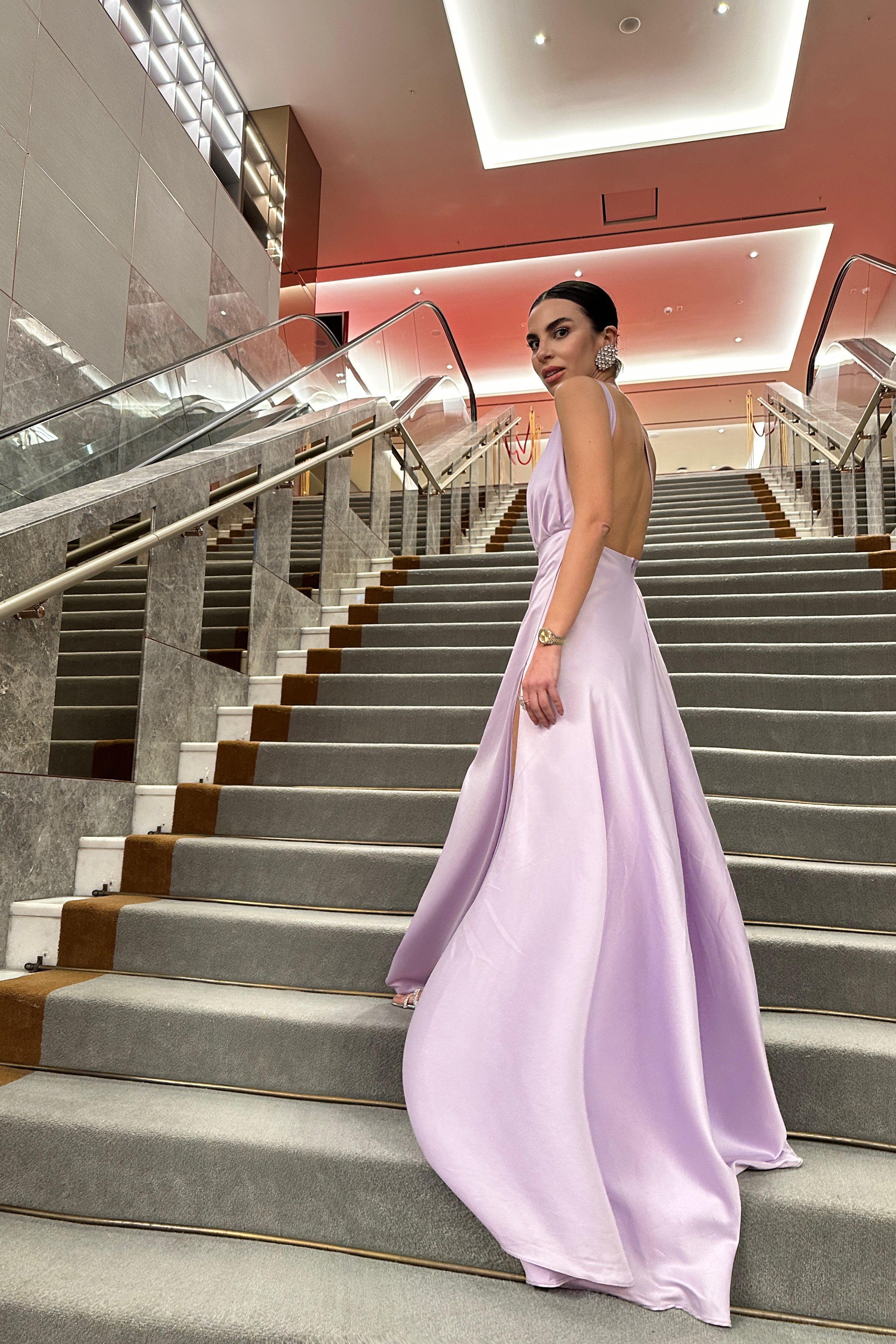 Tek omuz göğüs dekolteli sırtı açık derin yırtmaçlı uzun elbise