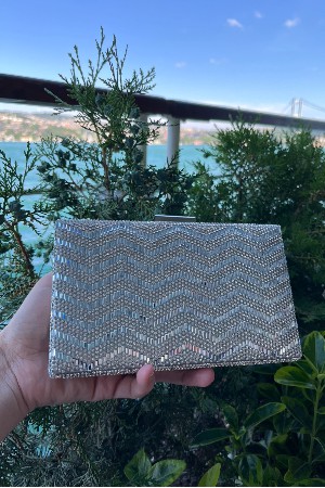 Kristal taşlı el çantası. İçindeki zincir askı ile de kullanılabilir.