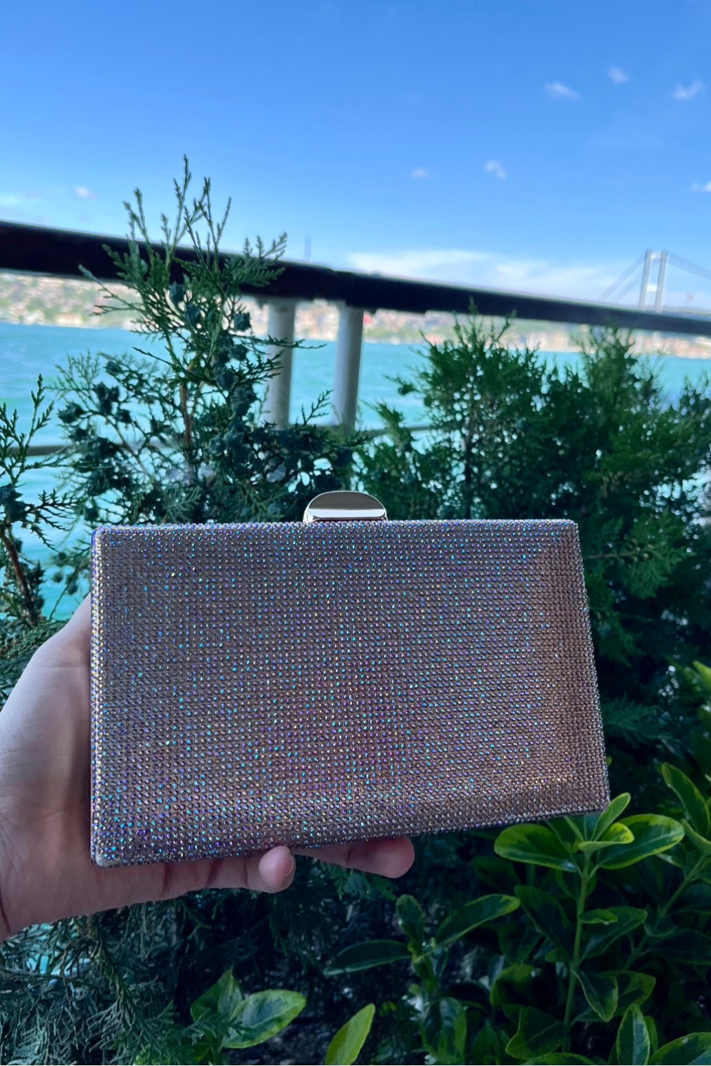 Rose Gold metal çerçeveli el çantası. İçindeki zincir ile askılı da kullanılabilir.