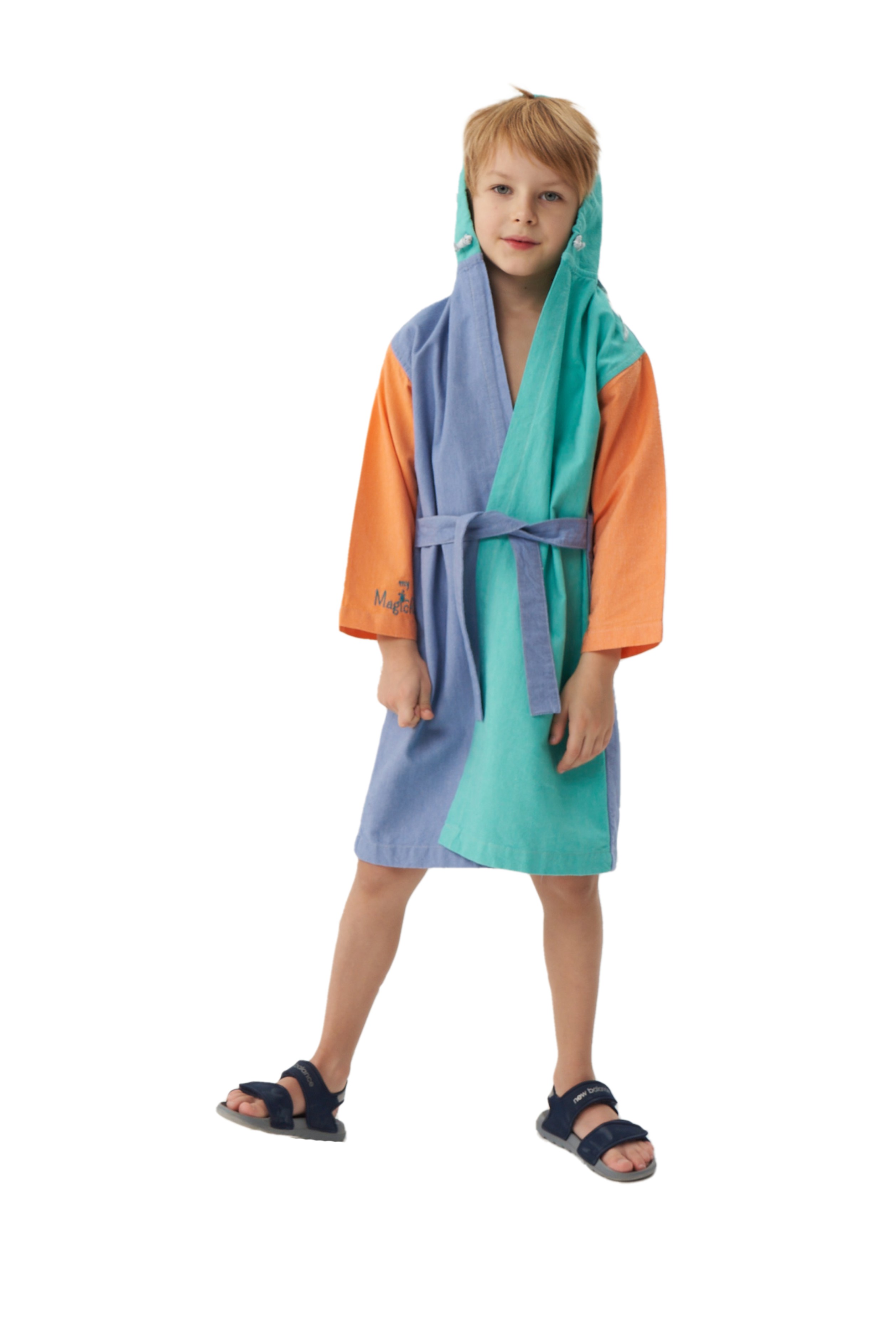 Ocean myMagicRobe ürünümüzün kollar turuncu, vücudun ön tarafları yeşil ve mavidir. Sırt kısmı da mavidir. Bu bornoz şapkasında çantaya dönüşebilir. myMagicRobe'unuzu her çantaya dönüştürdüğünüzde dalgaların sesini de yanınıza alacaksınız. Kumaşımız %100 pamuktur. Her yıkadığınızda daha yumuşak ve daha emici hale gelecektir.