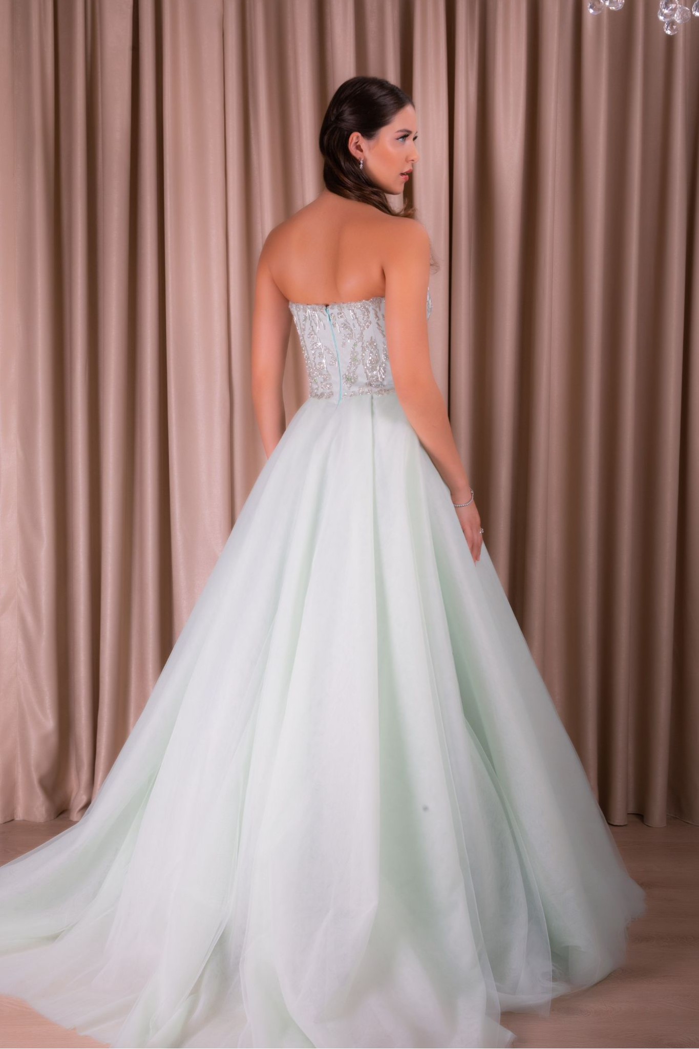 Straplez üst kısmı el işlemeli etekleri tül ve içi astarlı gece elbisesi