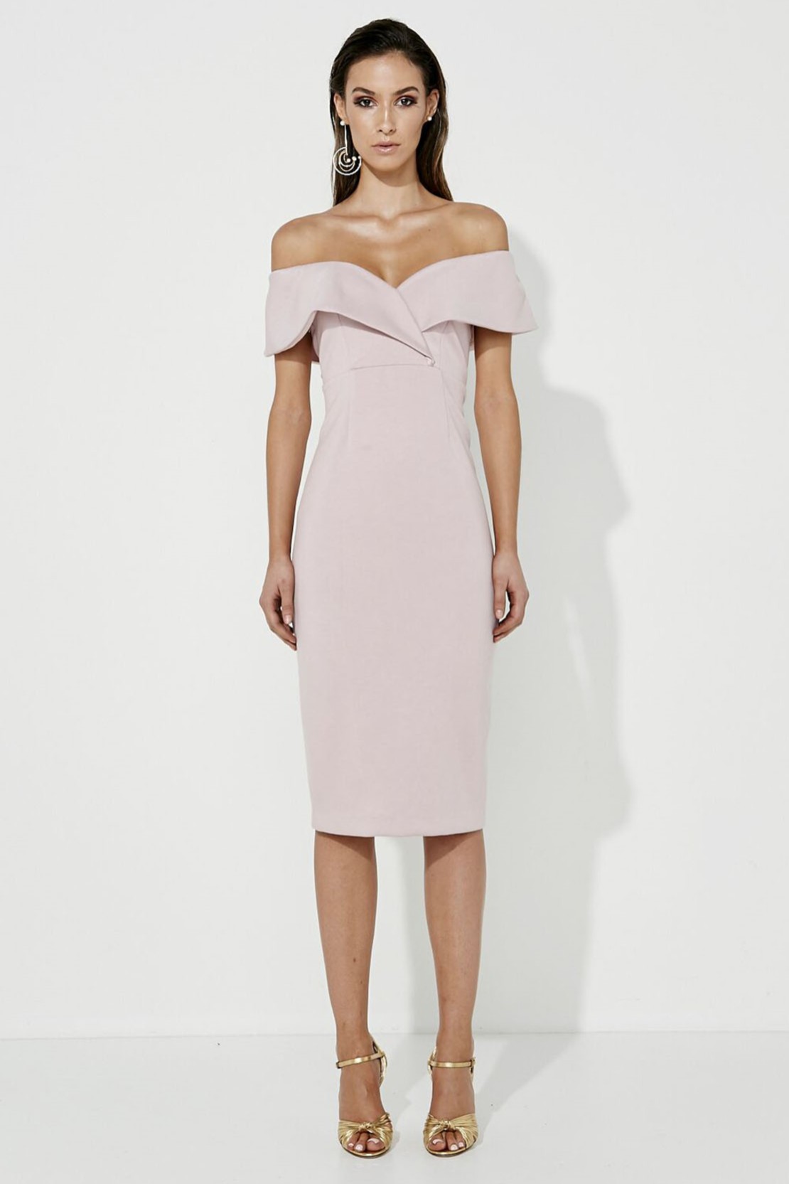 Düşük omuz pudra arkadan mini yırtmaçlı kokteyl elbisesi
