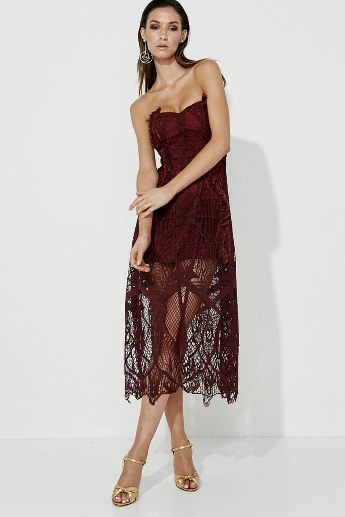 Straplez Dantel Detaylı Kısa Astarlı Midi Boy Kokteyl Elbise