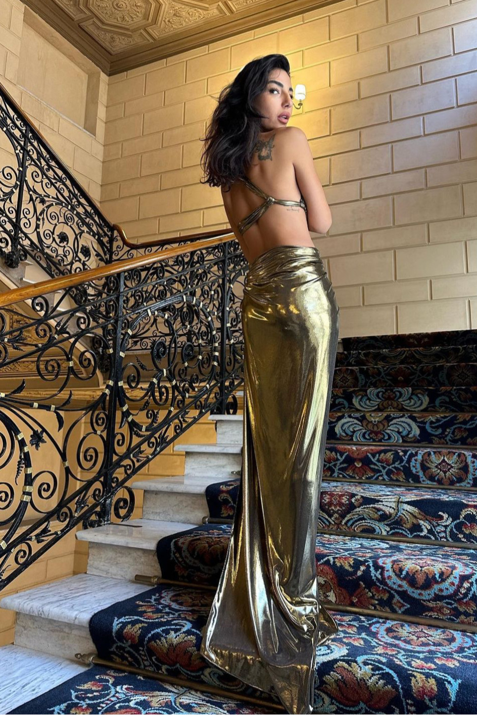 Göğüs ve bel dekolteli sırtı açık kıvrak yırtmaçlı bel göğüs dekoltesi ayarlanabilir ve ya değişebilir, gold gece elbisesi