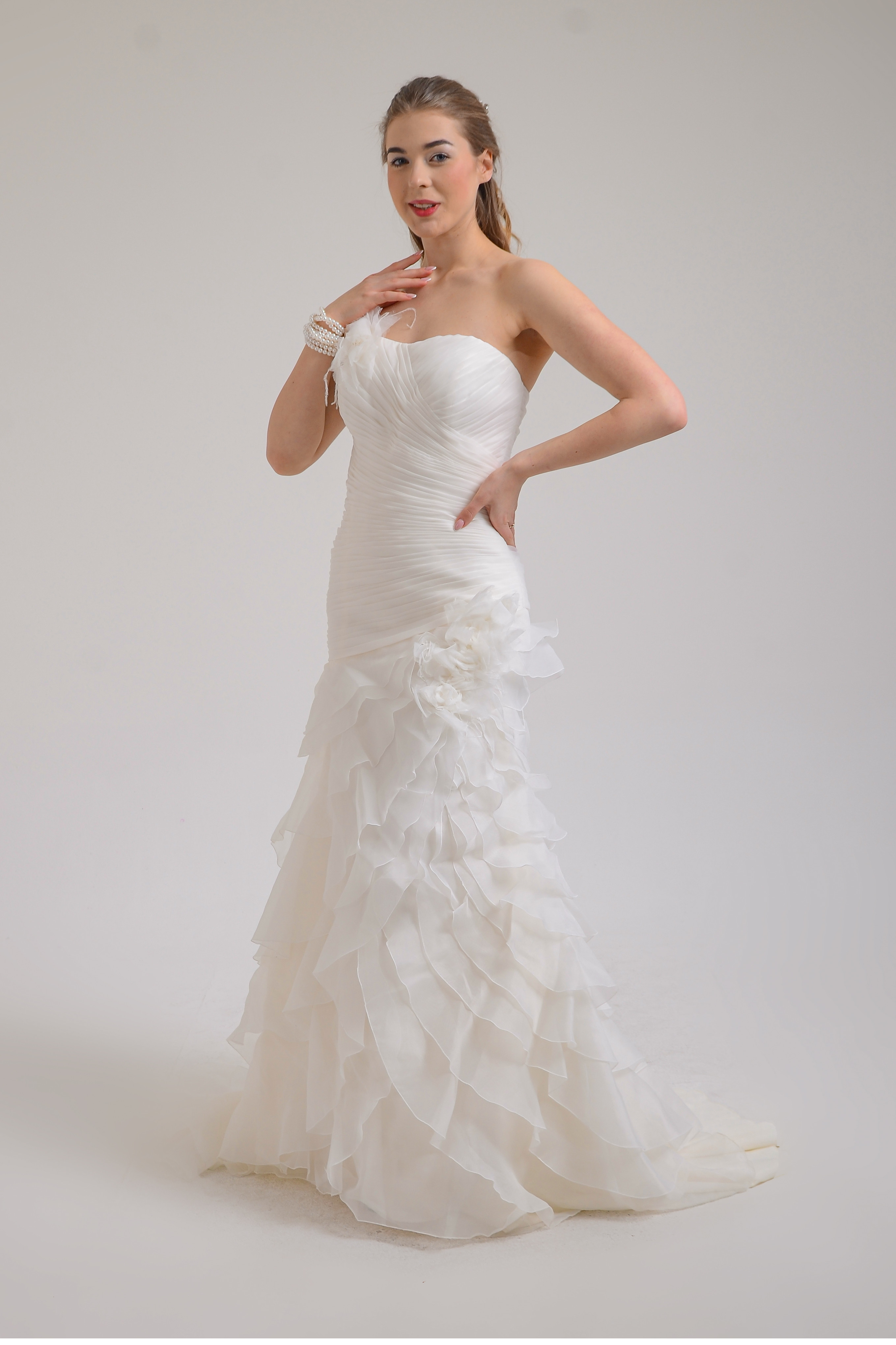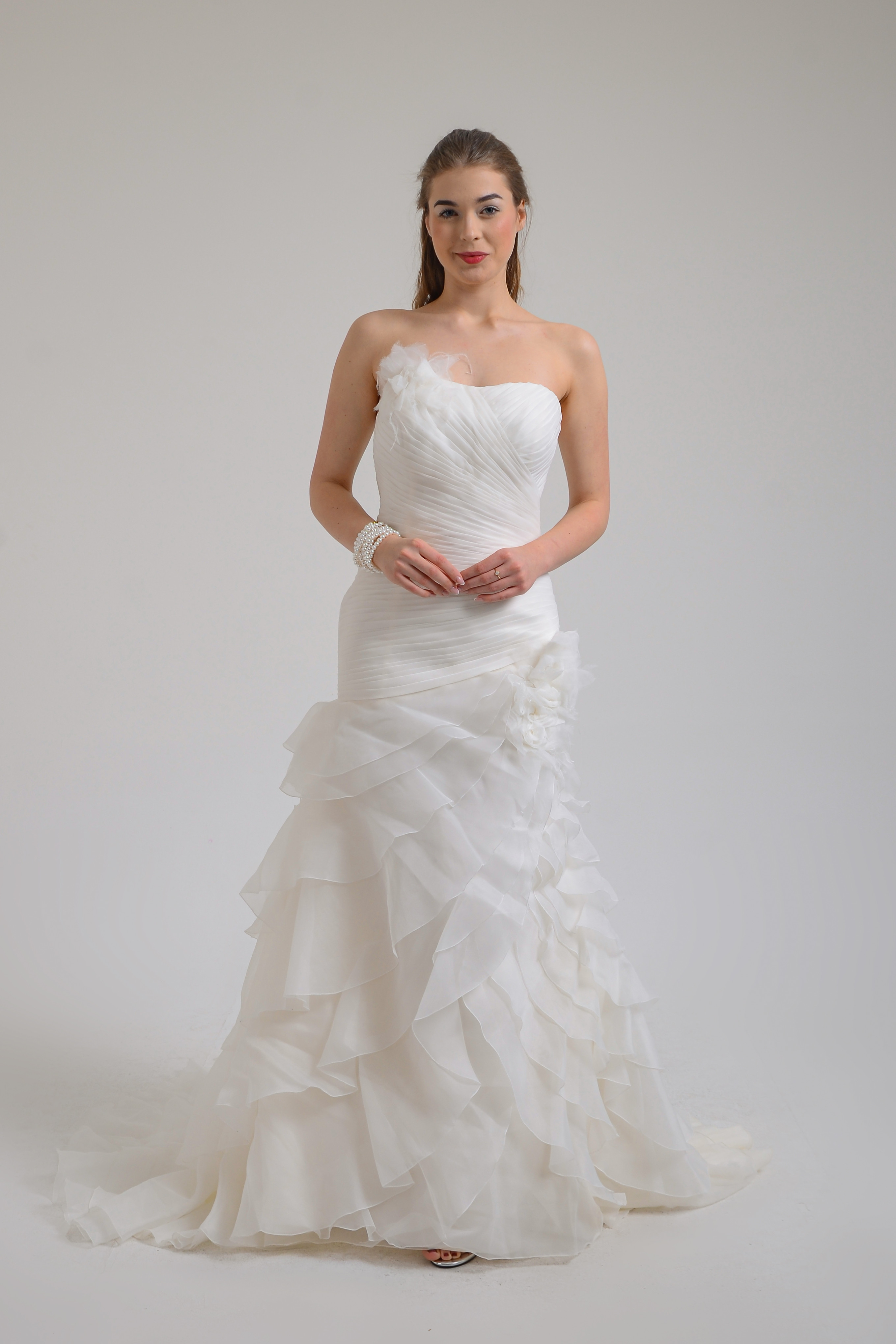 Straplez balık model üst kısmı güpür ve kristal boncuk işlemeli gelinlik. Bu gelinlik arkadan ayrıca takıp çıkarılabilen fırfırlı uzun kuyruklu ek etek ile de kullanılabilir.