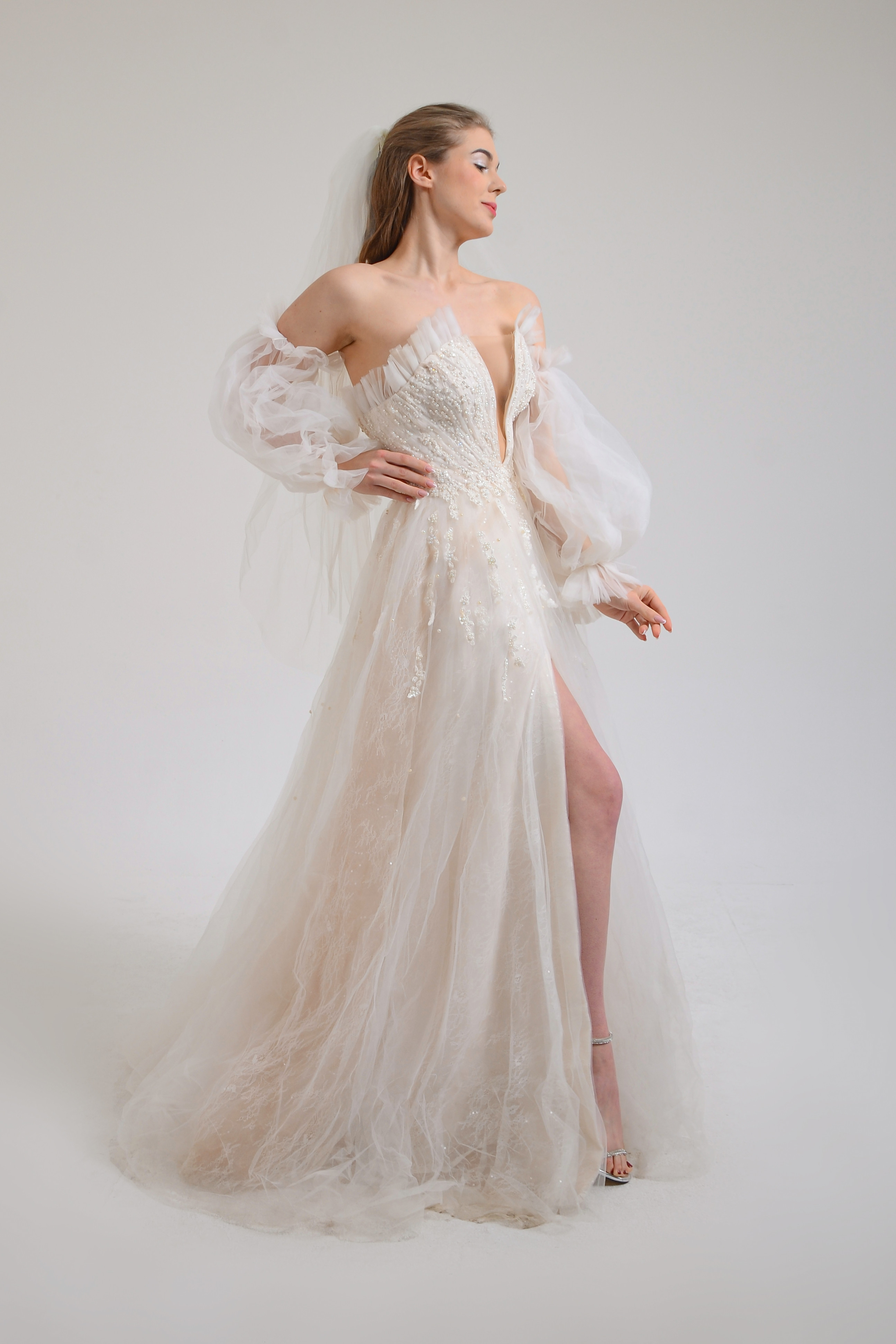 Straplez öndenderinnV kesim tül çıkabilen balon kol detaylı derin tek yırmlı uzun kuyruklu gelinlik
