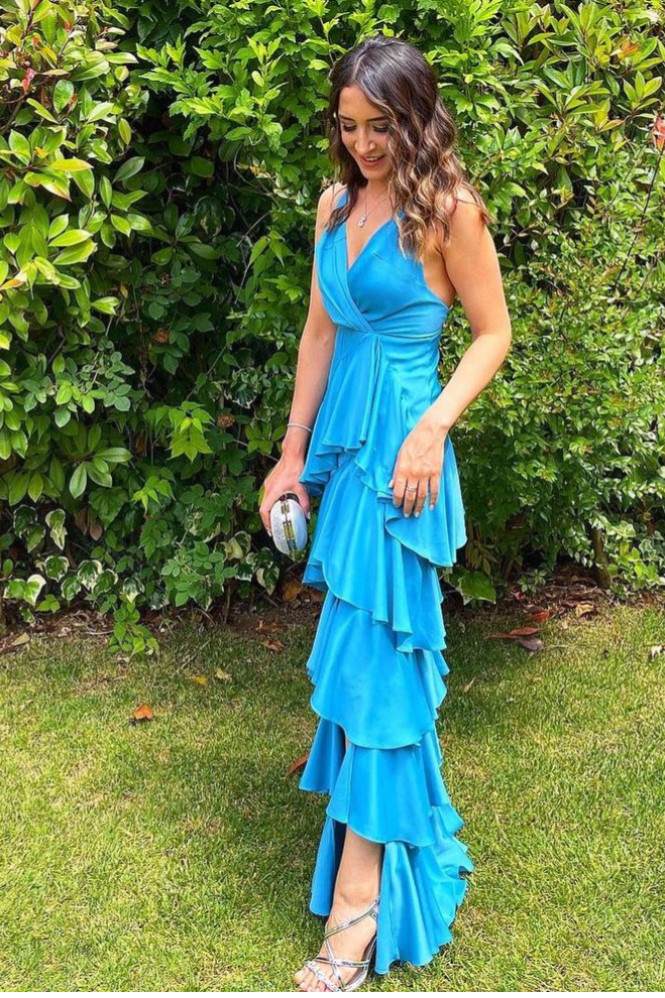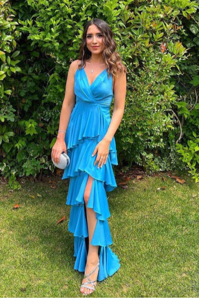 İnce askılı V yaka alt bölümü fırfırlı yandan yırtmaçlı mavi elbise
