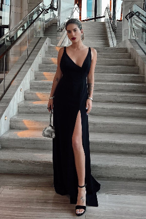 İnce askılı göğüs kısmı asimetrik derin dekolteli sırtı açık derin yırtmaçlı uzun elbise