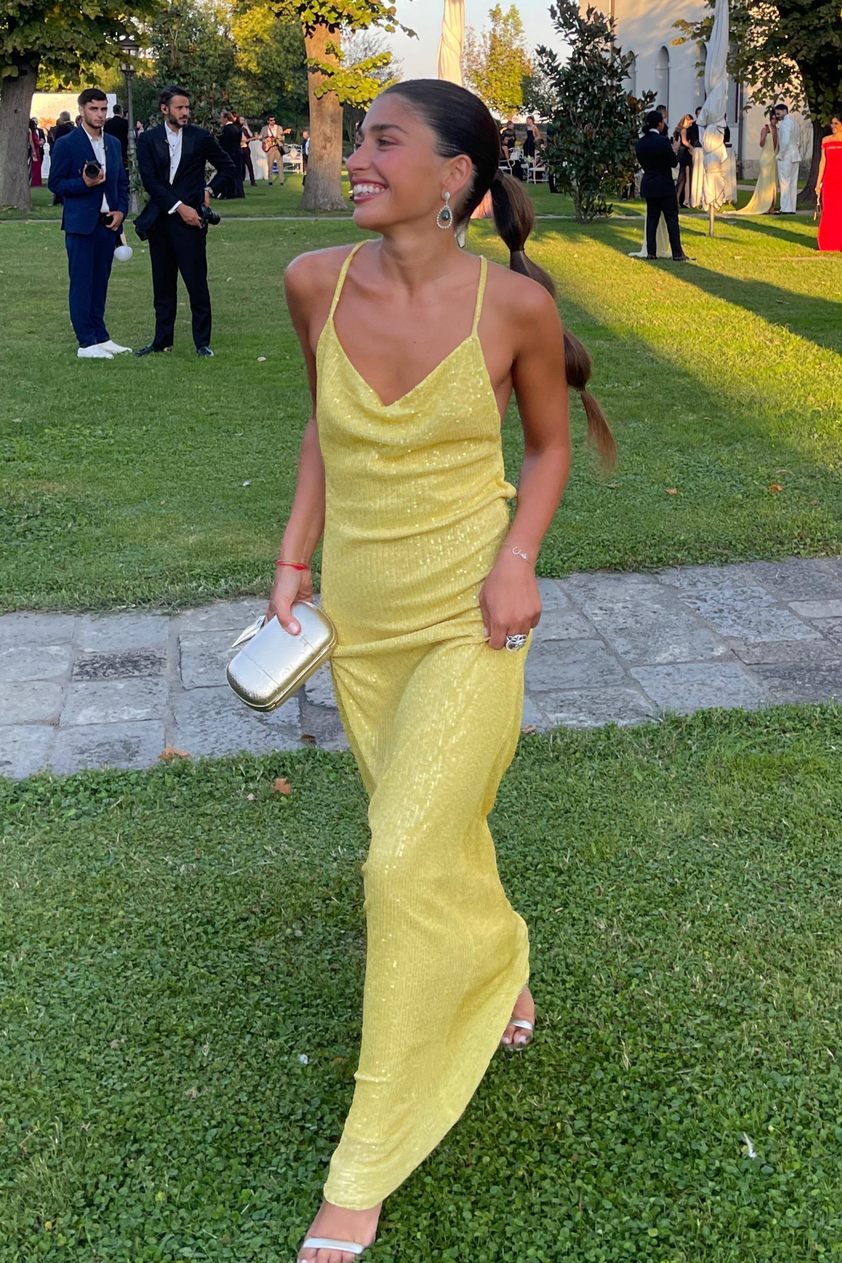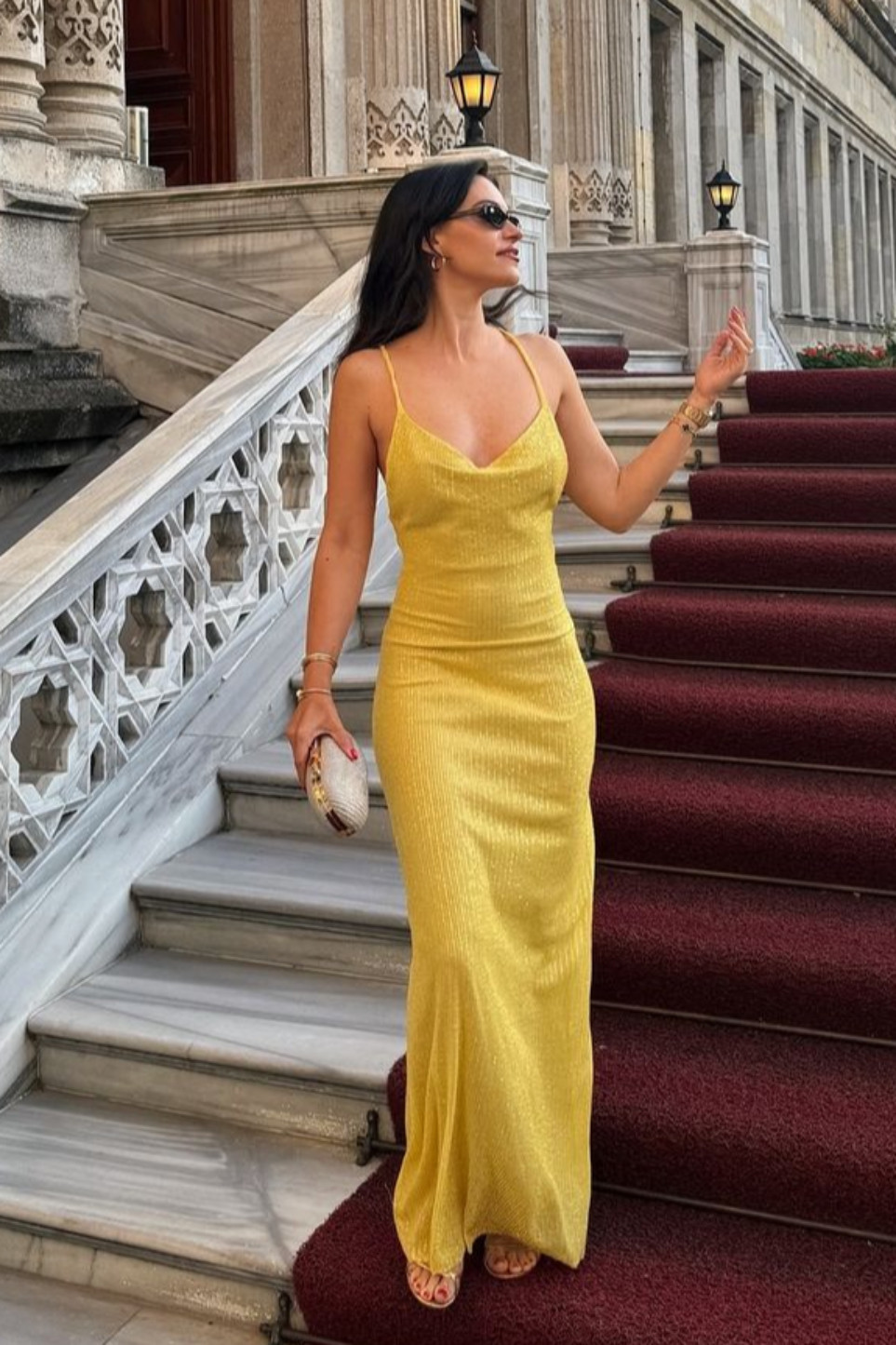 Sırtı çapraz askılı derin sırt dekolteli payetli uzun elbise