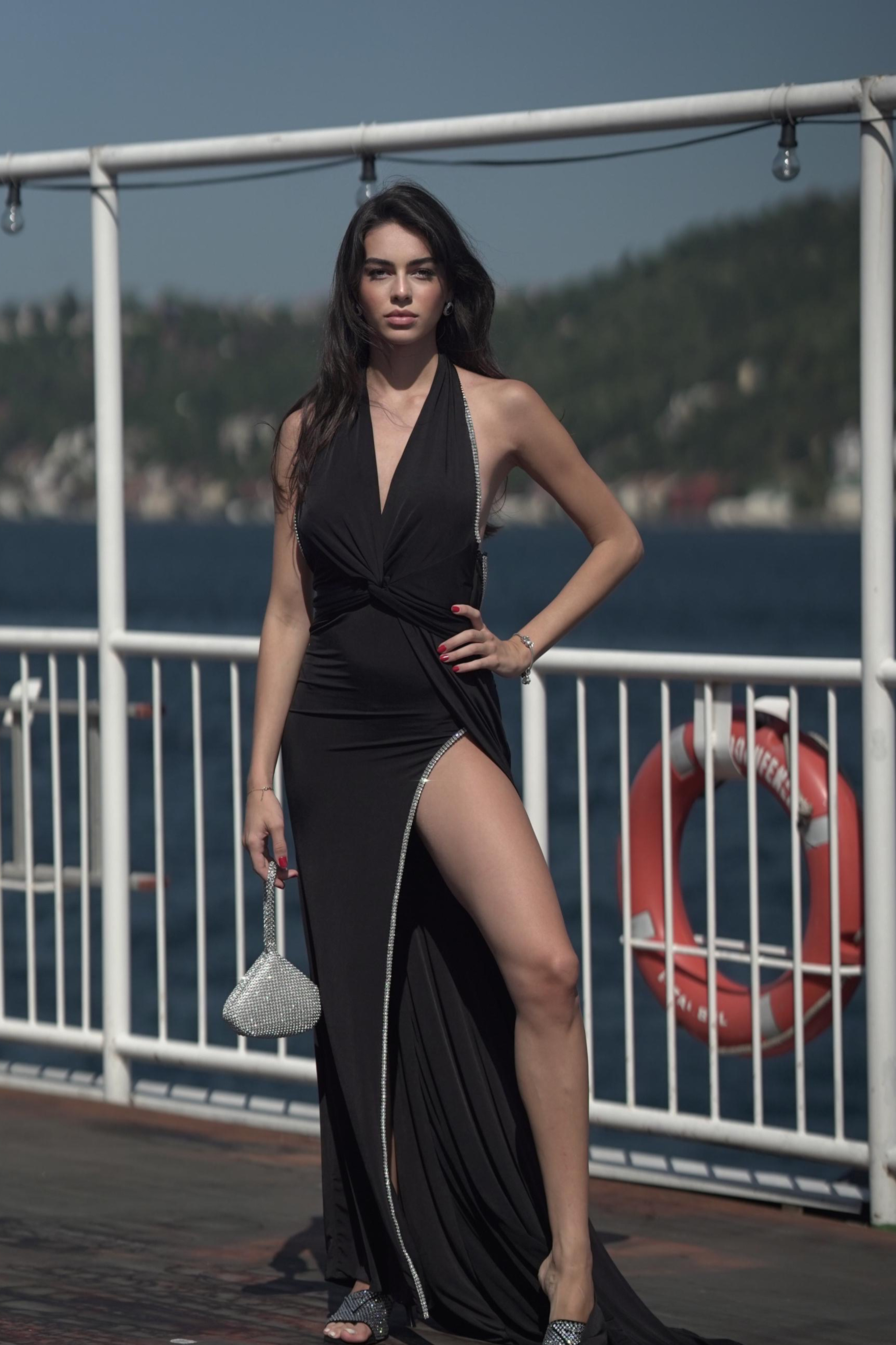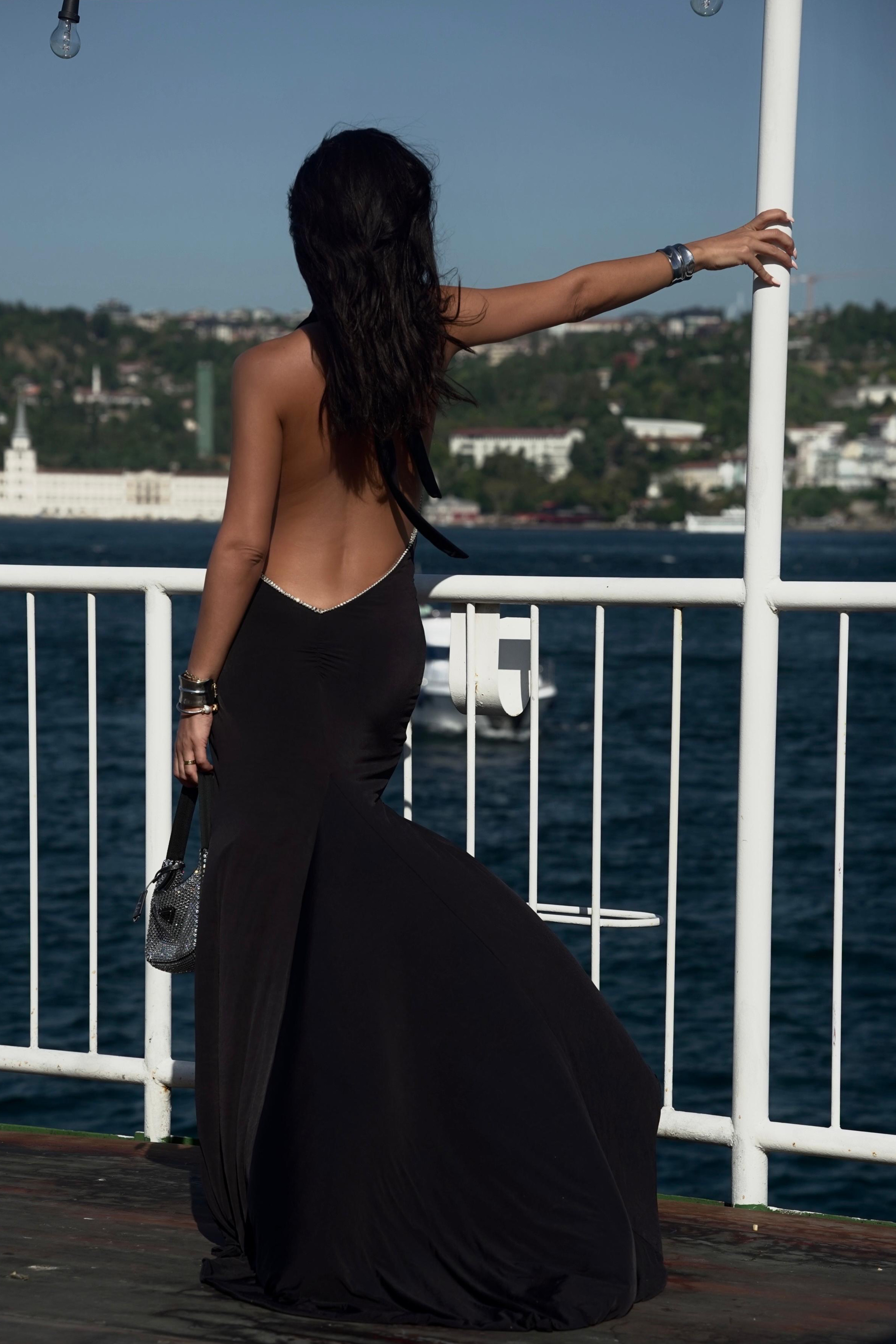 Derin V kesim göğüs dekolteli önden derin yırtmaçlı sırtı açık ve kristal işlemeli uzun gece elbisesi