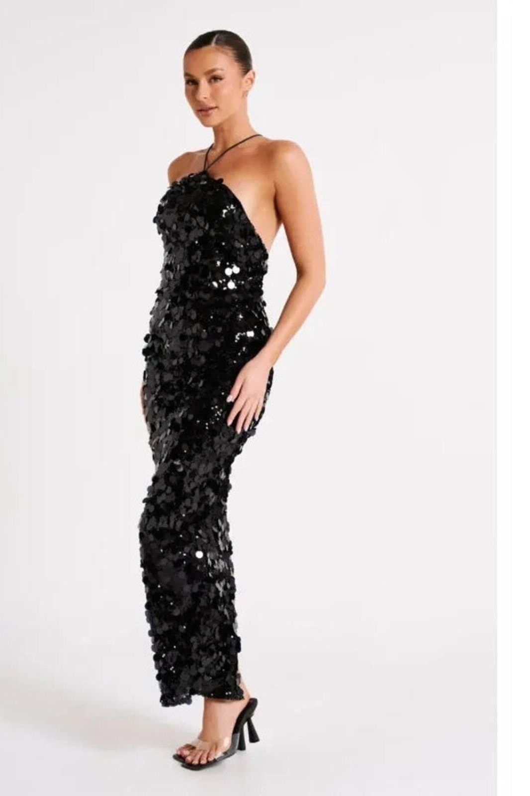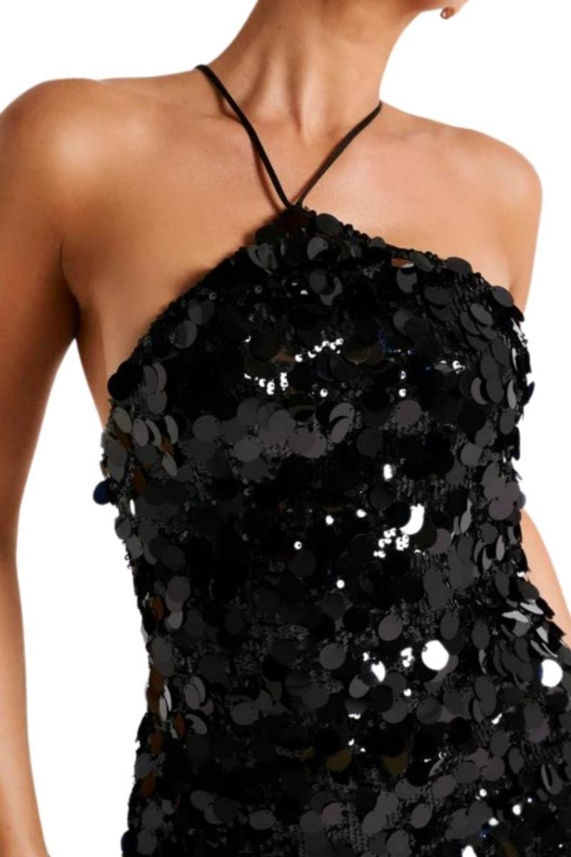 Sırt dekolteli payetli halter yakalı arkadan yırtmaçlı elbise
