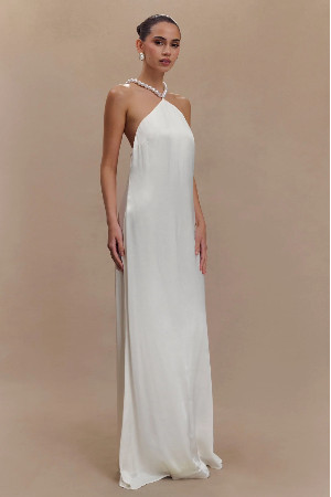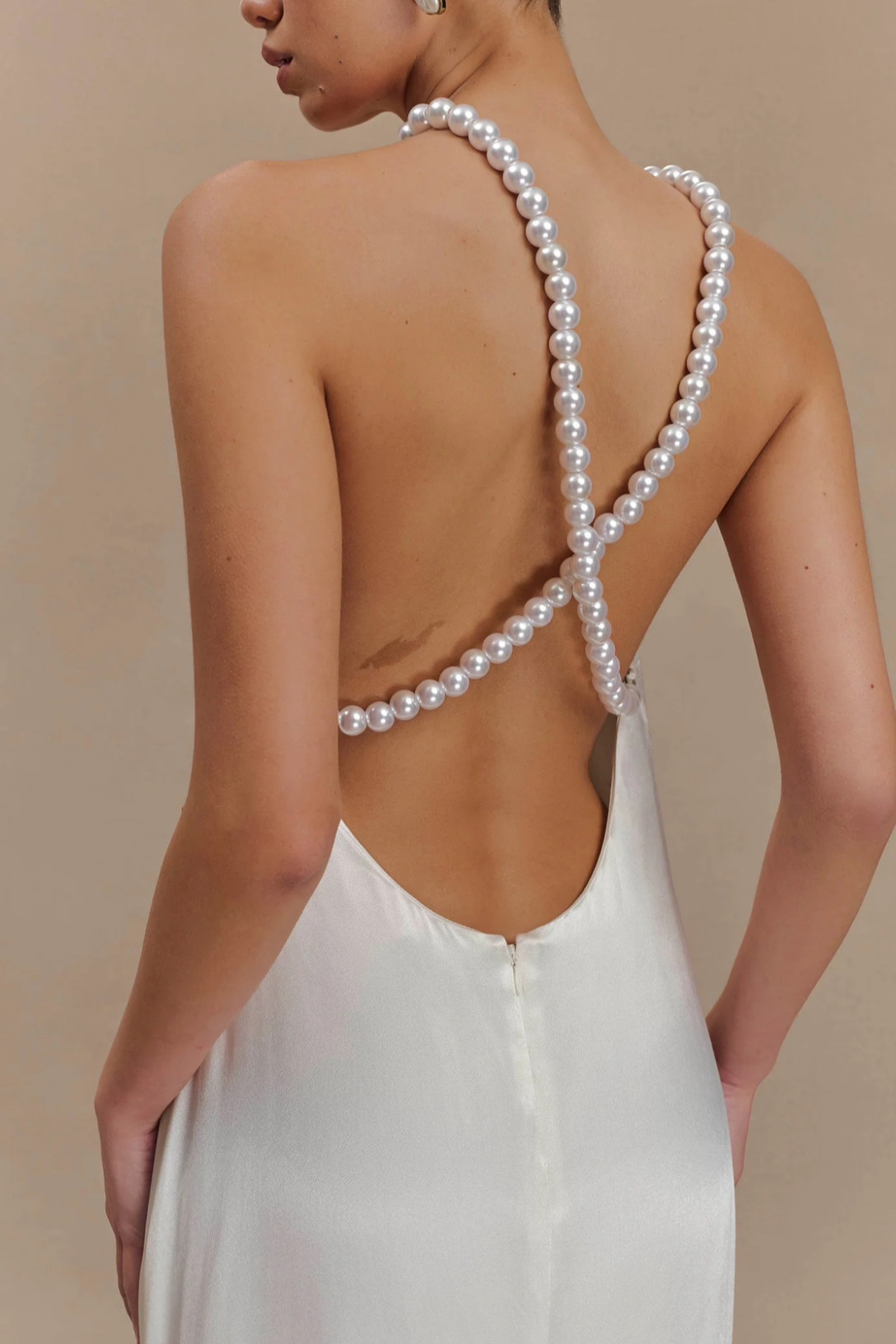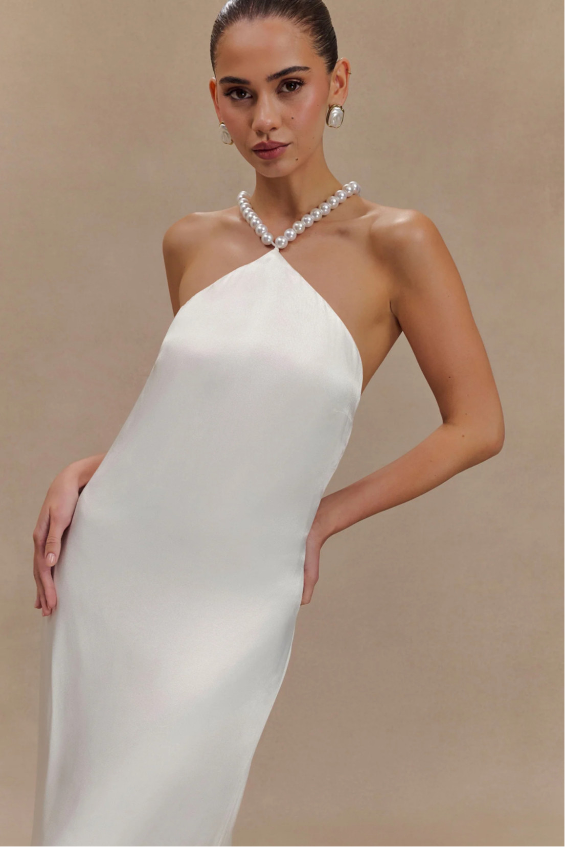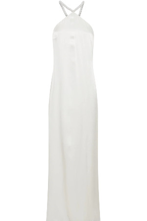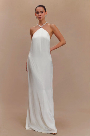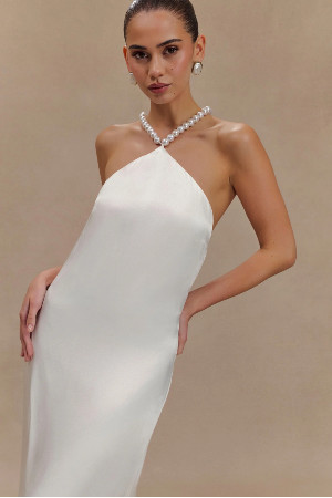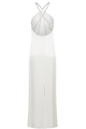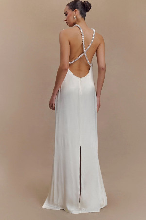 Halter yaka saten arkadan yırtmaçlı büyük inci askılı elbise