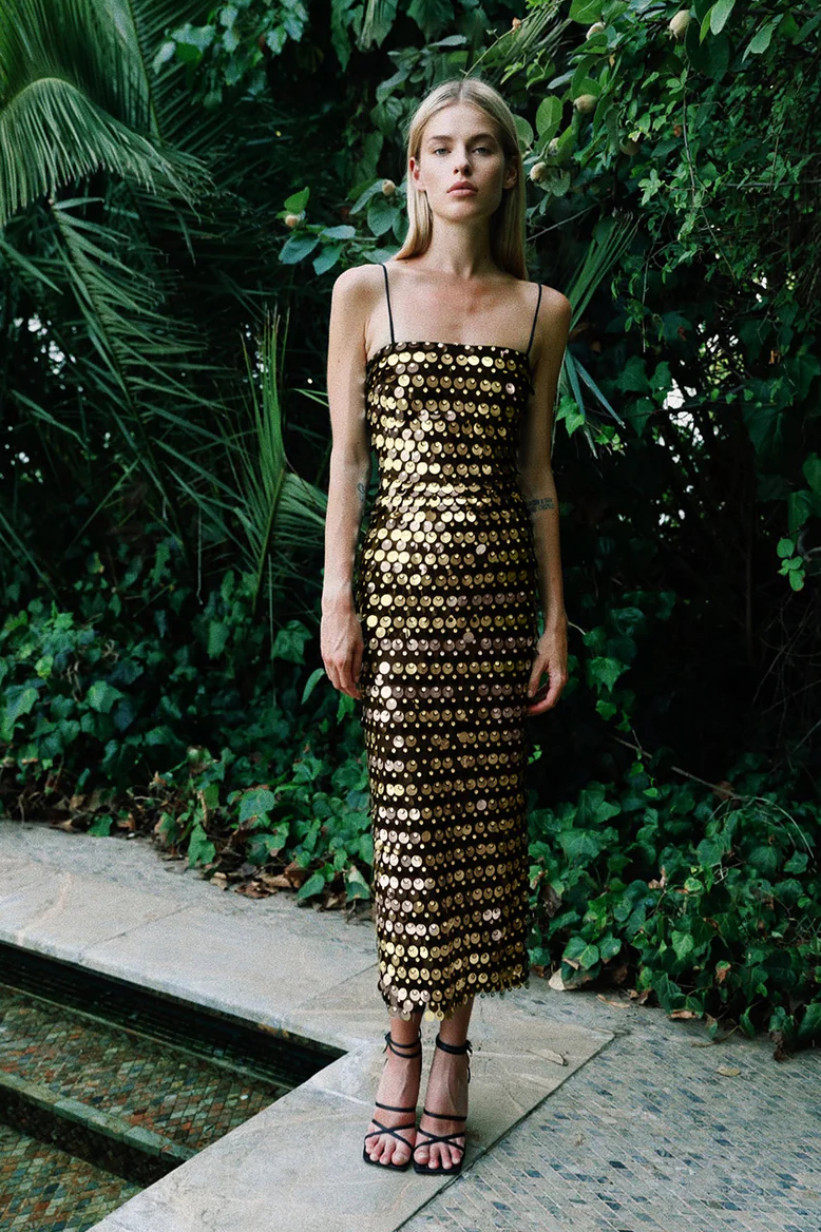 İnce askılı dar kesim gold büyük payetli gece elbisesi