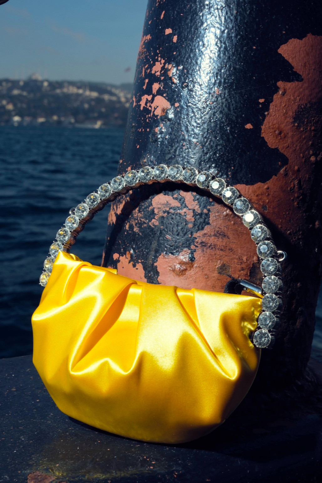 Kristal taşlı ve saten mini el çantası