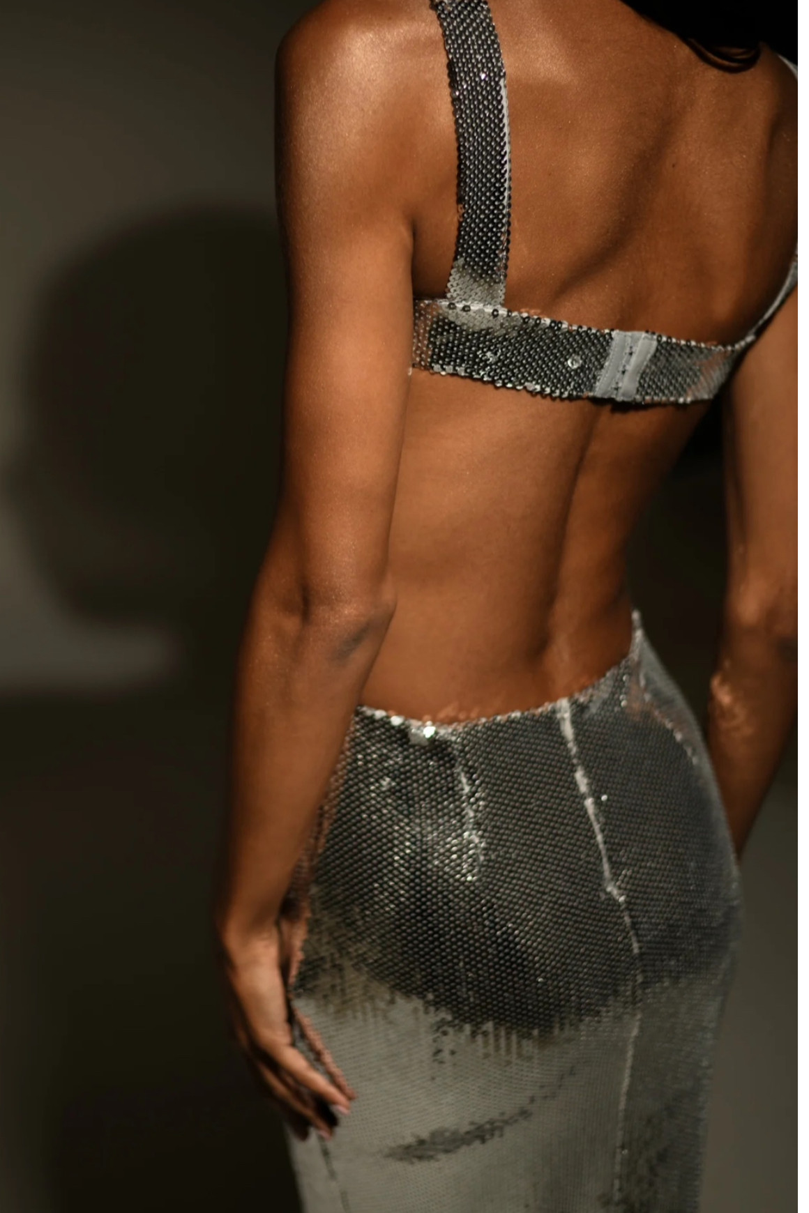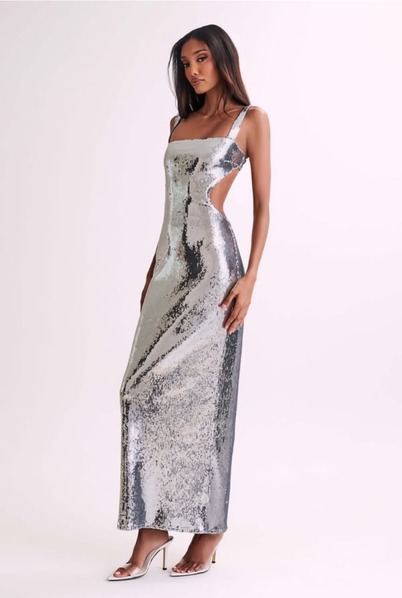 Sırtı dekolteli yanları açık gümüş payetli elbise